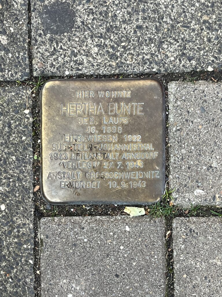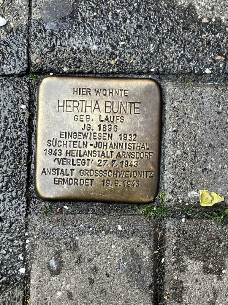 Zum Anlass des bundesweiten Gedenktags für die Opfer des Nationalsozialismus unternahmen wir am 11.11.2025, der Geschichtskurs des Jahrgangs 12, einen kleinen Ausflug. Unser Ziel war der Stolperstein von Hertha Bunte in der Sophienstraße 22. Zu Beginn wurde der Stolperstein symbolisch gereinigt,im Anschluss hielt eine Schülerin einen kurzen Vortrag über das Schicksal von Hertha Bunte.