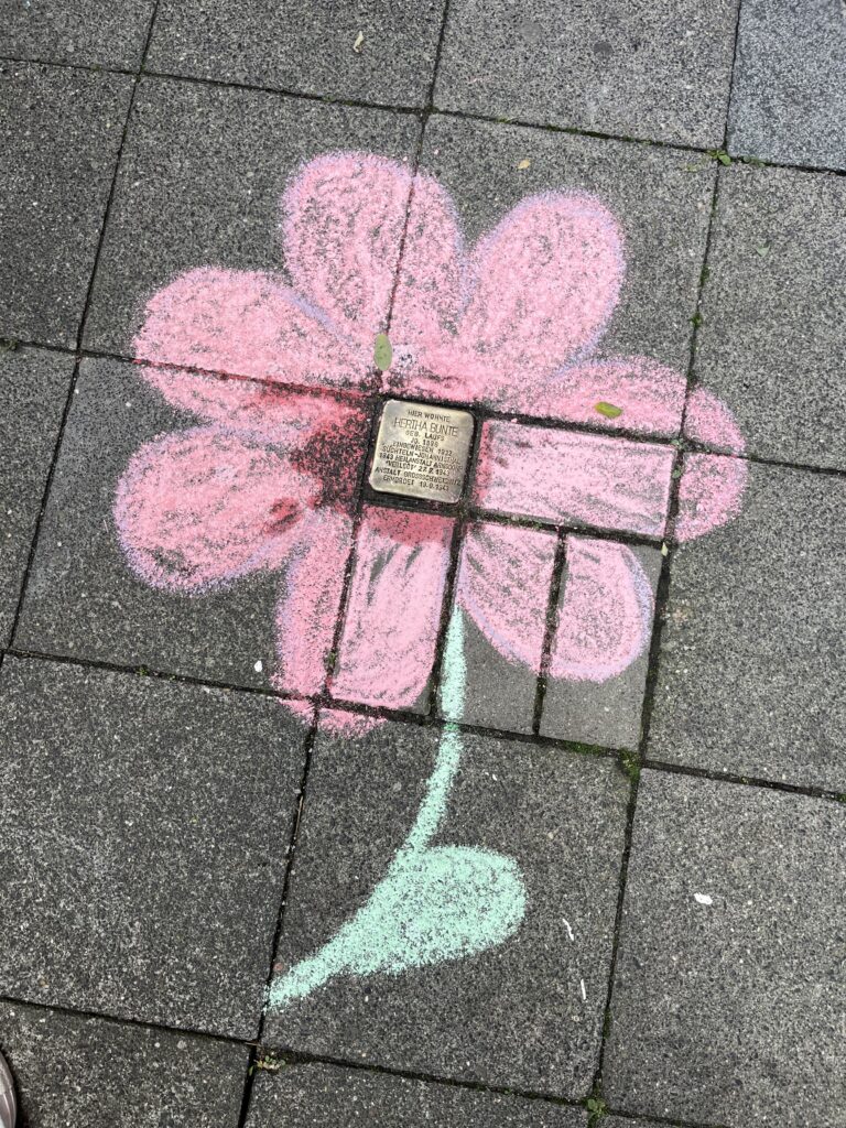Um den Stolperstein sichtbarer zu machen, entschieden wir uns, ihn mit einem Kreidemotiv zu umrahmen. Wir wählten eine Blume, da Blumen traditionell als Zeichen des Gedenkens an Verstorbene gelten. In unserer anschließenden Debatte kamen wir außerdem zu der Ansicht dass, Stolpersteine etwas auffälliger gestaltet werden sollten oder leicht aus dem Boden herausragen sollten, damit sie stärker ins Bewusstsein rücken und man im übertragenen Sinn wirklich „darüber stolpert“.