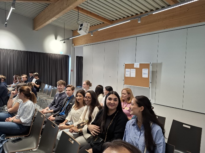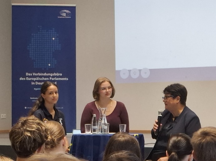 B&B Hotel Am nächsten Morgen, dem 19.09.2025, frühstückten alle Teilnehmer*innen in ihren Hotels und checkten anschließend aus. Um 7:45 Uhr traf sich unsere Gruppe mit den beiden Lehrkräften in der Hotellobby, um gemeinsam den Weg zurück nach Langerwehe anzutreten. Dort begann der zweite Konferenztag um 9:00 Uhr mit einer Begrüßung und einem gemeinsamen Einstieg. Zunächst richtete der Bürgermeister einige Worte an die Teilnehmer, ehe das zentrale Abgeordnetengespräch mit Frau Sabine Verheyen, der ersten Vizepräsidentin des Europäischen Parlaments, stattfand. In diesem Gespräch beantwortete sie Fragen zu verschiedenen Themen. Das Interview führten Salma aus unserer Schule sowie eine weitere Schülerin einer anderen Schule. Auch das Publikum hatte die Gelegenheit, Fragen zu stellen, die Frau Verheyen offen und ausführlich beantwortete. Nach diesem wichtigen