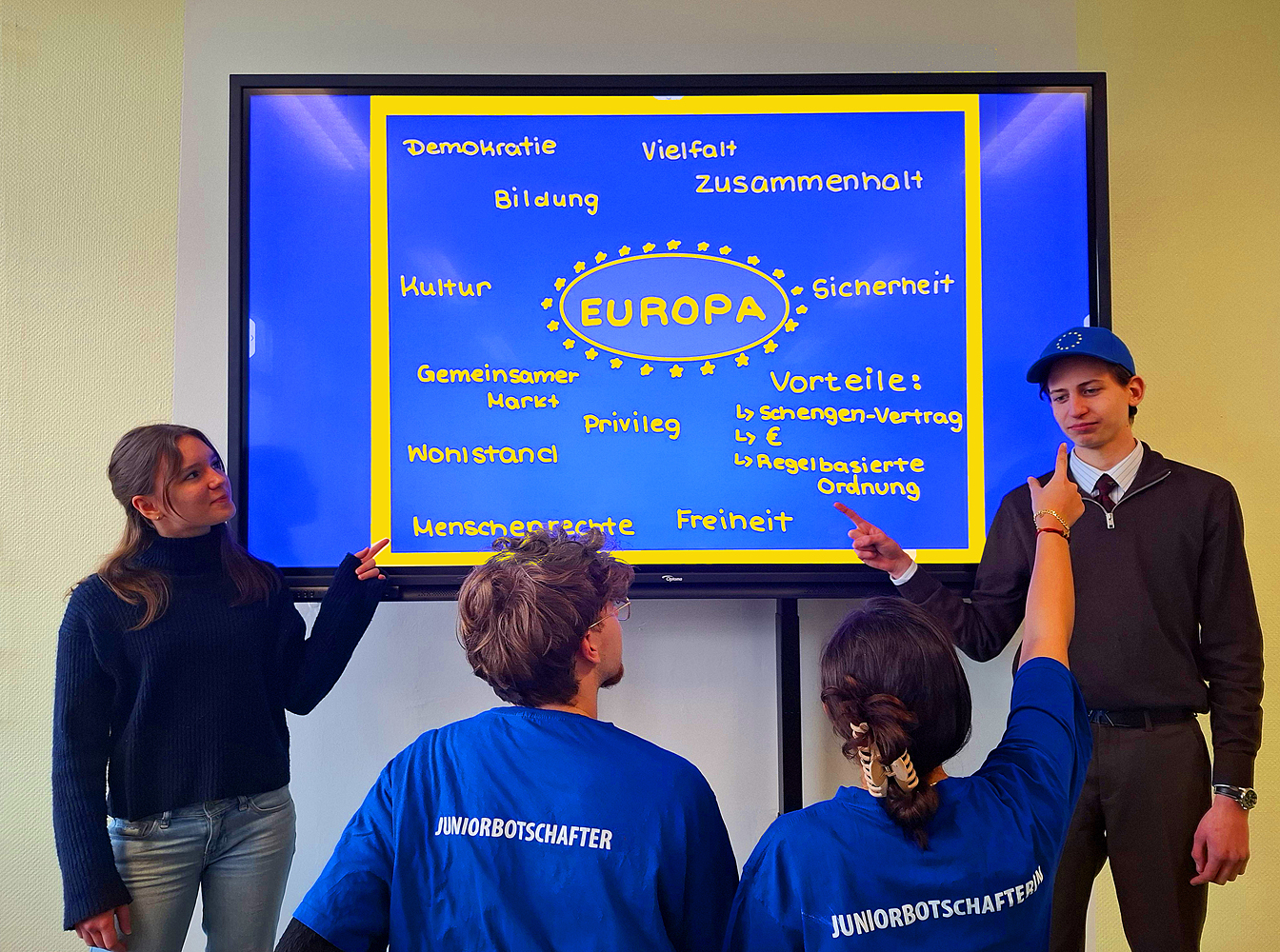 Wofür steht für dich die EU? Wir als EU-Bürger sind privilegiert, denn Europa steht für Zusammenhalt, Freiheit und Vielfalt und verbindet Bildung und Kultur über Grenzen hinweg. Es ist ein Raum, in dem Demokratie aktiv gelebt und Menschenrechte geachtet werden. Sicherheit, Respekt und Regeln gehören zu unseren Werten wie Solidarität und Toleranz. Durch den EU-Markt, den Euro und den Schengen-Vertrag eröffnen sich Chancen und Grenzen werden überwunden. Wir als Junior-Botschafter stehen für diese Werte und geben sie weiter. |