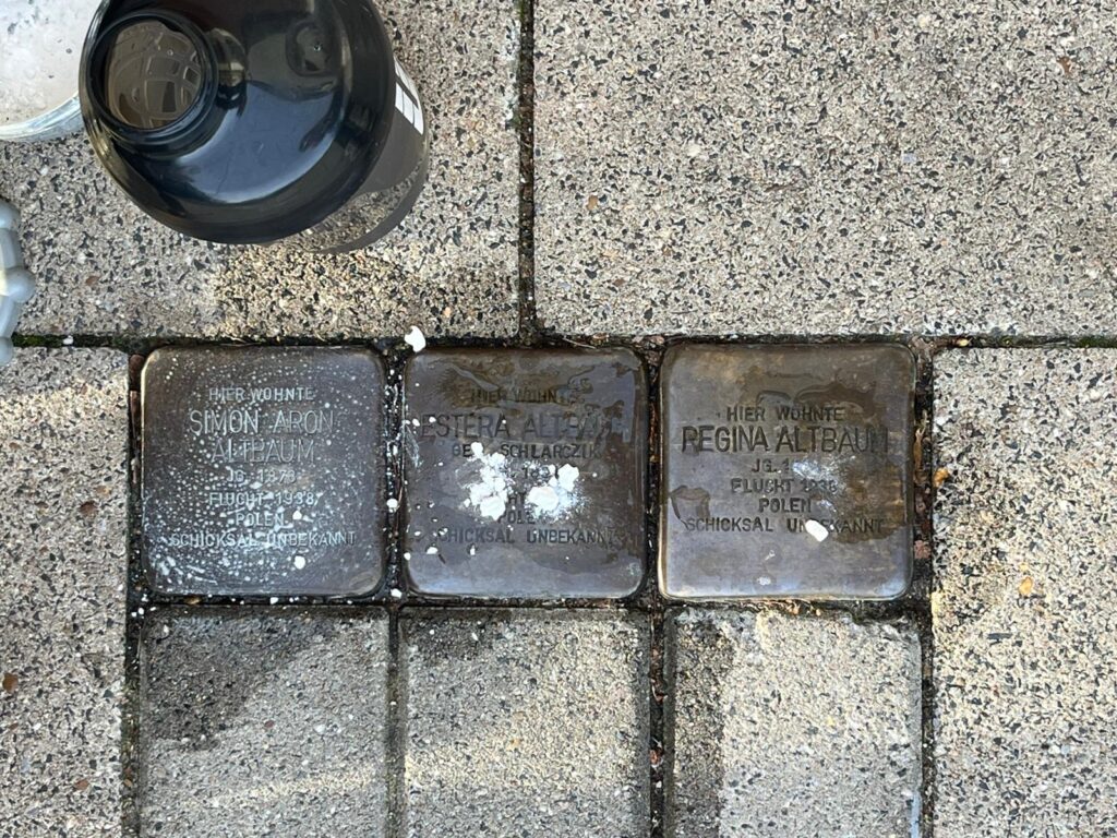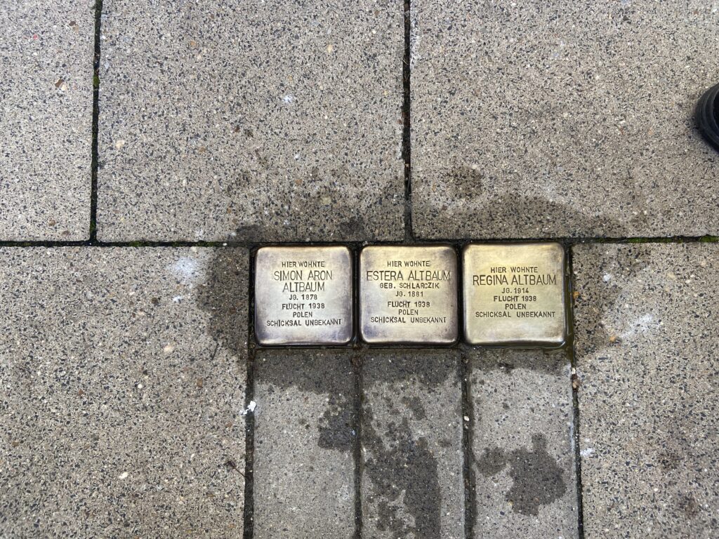 Daraufhin gingen wir gemeinsam zu den Stolpersteinen. Vor Ort beschrieben viele aus der Klasse die Atmosphäre als bedrückend, da das Gedenken im direkten Anblick besonders nahegeht. Einige schilderten zusätzlich, dass sie sich die Familie Altbaum bildlich an diesem Ort vorstellen konnten, wie sie dort gelebt haben könnten und welchen Alltag sie möglicherweise hatten. Dies sorgte bei vielen für ein sehr persönliches und emotionales Erleben.